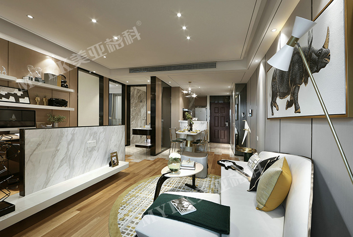 空間寧靜的外表下藏著一顆熾熱的內心,撲面而來的輕奢優雅,質樸自然的現代設計融合當代美學理念,營造出一種輕奢的生活氛圍。在創造空間質感的同時,一點綠色來出挑活潑的感覺,調和出愜意的生活。